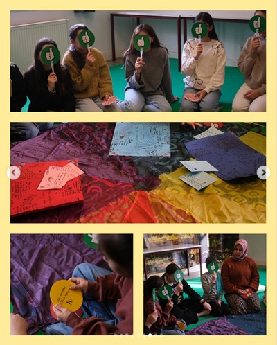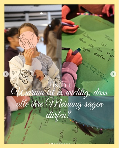 Besonders aufregend war das World-Cafe: An verschiedenen Tischen lagen Fragen auf bunten Plakaten, die die Kinder gemeinsam bearbeiteten. Sie schrieben ihre Gedanken dazu auf, wechselten die Tische und tauschten sich immer wieder neu aus. 📝🎨